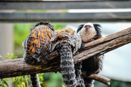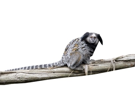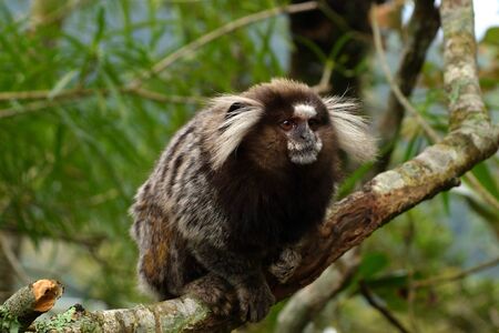White-headed marmoset. Little monkey is perching on tree branch. Callithrix geoffroyi, also known as the tufted-ear marmoset, Geoffroy's marmoset, or Geoffrey's marmoset.