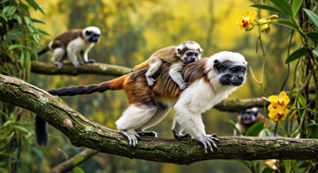 Golden lion tamarin parent carrying baby, showing family bond and nurturing