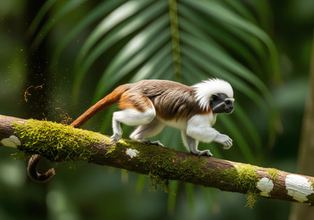Cotton-top Tamarin Moving Through Lush Green Rainforest Foliage on a Mossy Branch