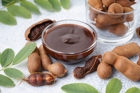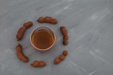 Tamarind drink or juice and ripe tamarinds on gray background. Selective focus, copy space.