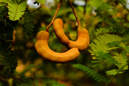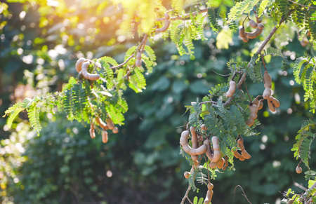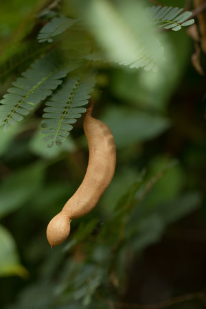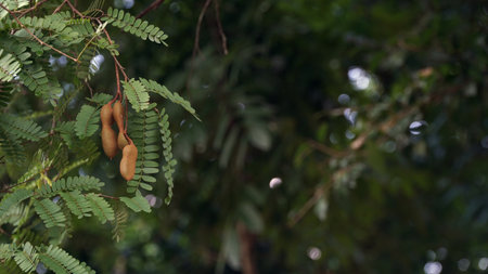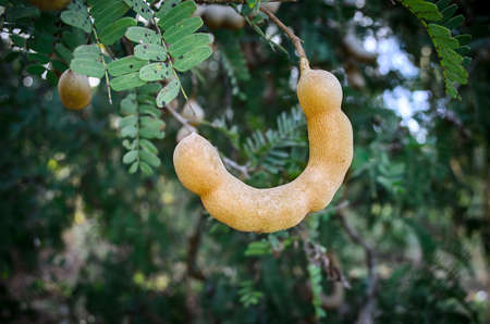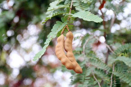 Tamarind fruit hangs on the tree. Blur background of green leaves
