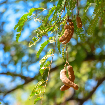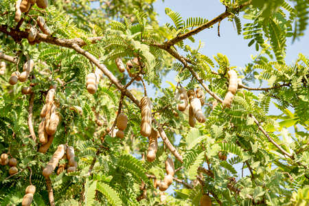 Tamarind tree, ripe tamarind fruit on tree with leaves in summer background, Tamarind plantation agricultural farm orchard tropical garden