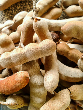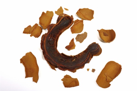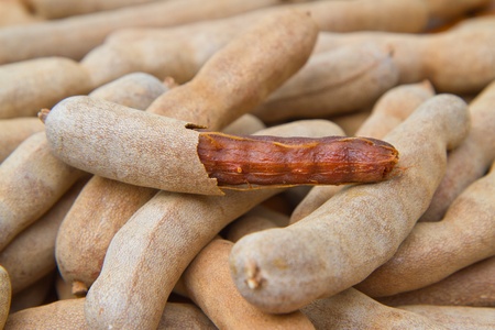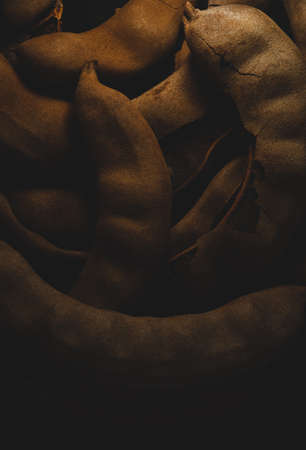 Fruits of tropcal Africal tree tamarind, used in cooking, traditional medicine and metal polish close up