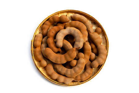 fruit tamarindus indica Sweet tamarind fruit in a basket, white background.