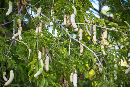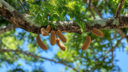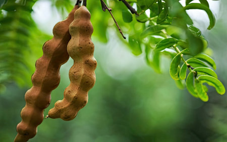 Close-up of ripe and unripe tamarind pods hanging from branches of a tamarind tree with green leaves