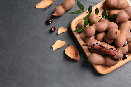 Delicious ripe tamarinds on black table, flat lay. Space for text