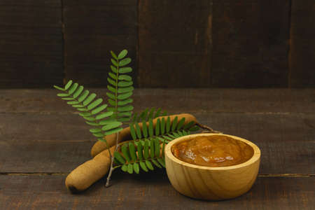 Tamarind juice in bowl wooden and tamarind fresh tropical fruit with leaf on wooden background for cooking, dark tone.
