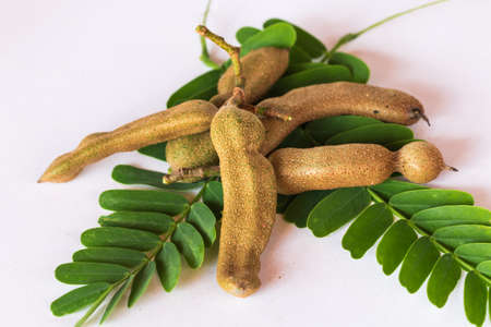 Tamarind_ bean like pods filled with seeds surrounded by a fibrous pulp arranged in a white textured background with its fresh green leaf.