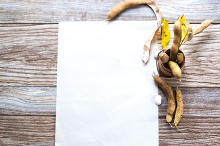 Tamarind set for health & Beauty treatment spa, hair, skin scrub, diet fruits & snack, Tamarind ripe peel shell on table