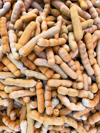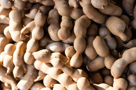 top view of Pile of ripe Tamarind fruits.Sweet ripe tamarinds.