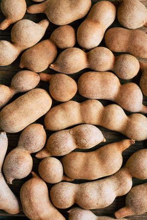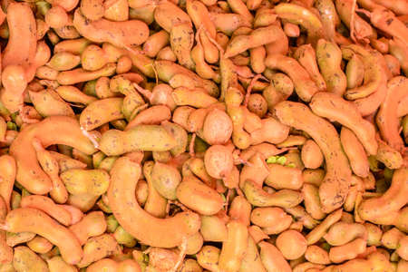 top view of Pile of ripe Tamarind fruits.Sweet ripe tamarinds.