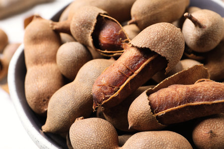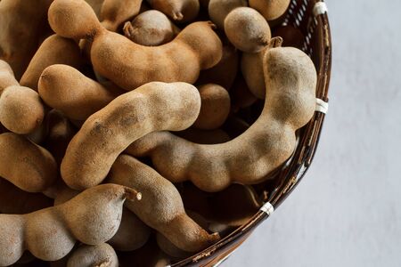 Tamarind_ bean like pods filled with seeds surrounded by a fibrous pulp arranged in a basket with white textured background.