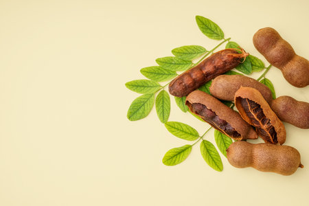 Sweet ripe tamarind with palm leaves on rattan background. Copy space. Tropical travel, exotic fruit. Vegan and vegetarian concept.