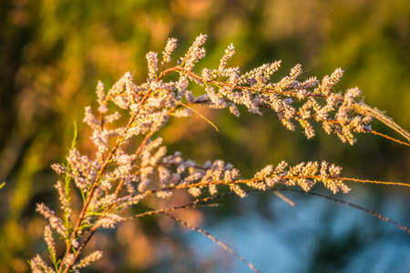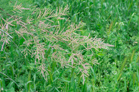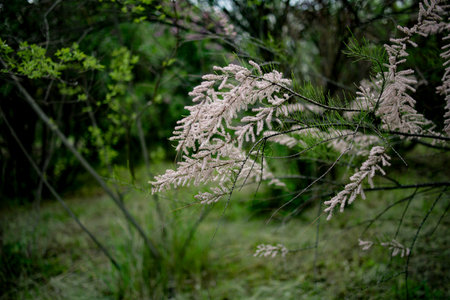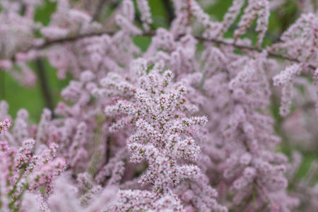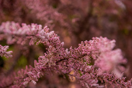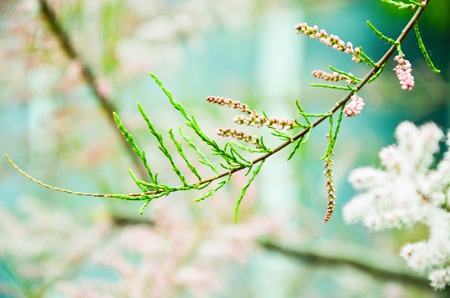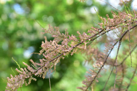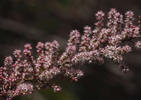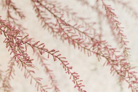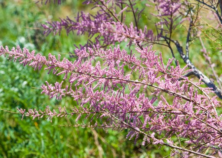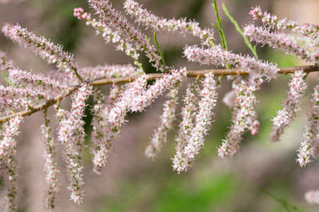 tamarisk branch in bloom - tamarisk, salt cedar - close up in spring. Selectiv focus.