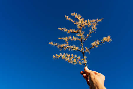 hold a spruce branch in your hand against the sky, autumn minimalistic concept, yellow branch against the blue sky, larch in autumn