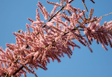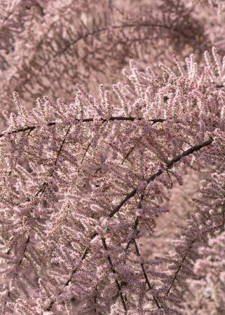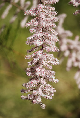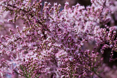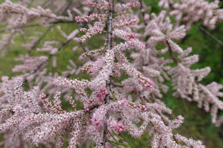 Details from Tamarix meyeri Boiss flowering shrub in the garden, Sofia, Bulgaria