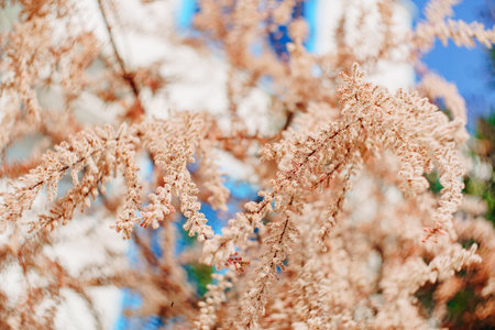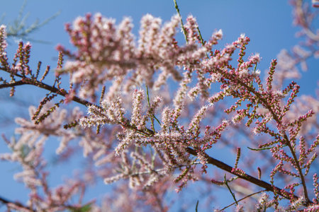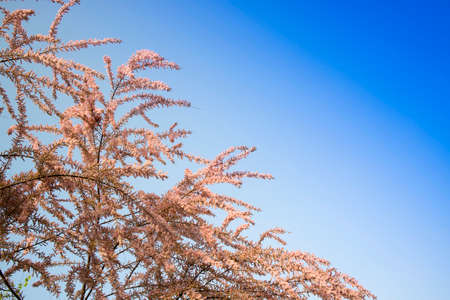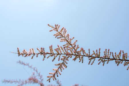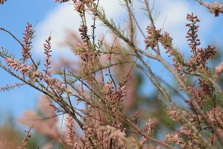Tamarisk, tamarix, salt cedar, barley, savory, partial branches of tree or shrub. Evergreen deciduous plant, pink flowers, blooming, ornamental, flora, grow on saline soils. Day, blue sky background.