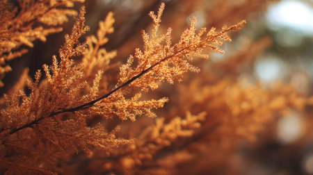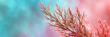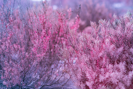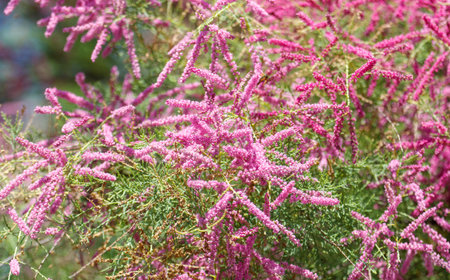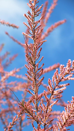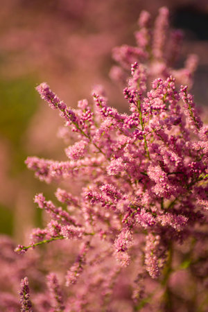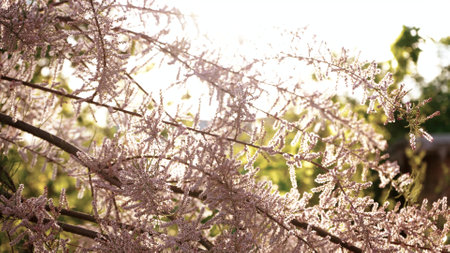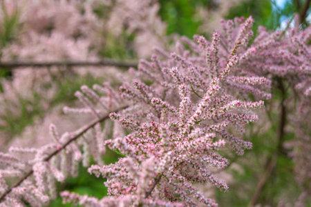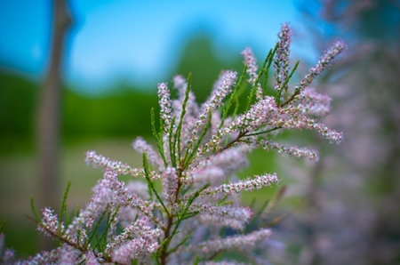 Close-up view capturing blooming tamarix branches adorned with delicate pink flowers, creating a dreamy and romantic atmosphere within a vibrant natural setting