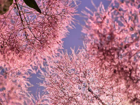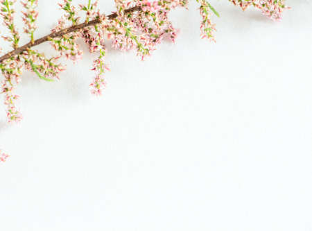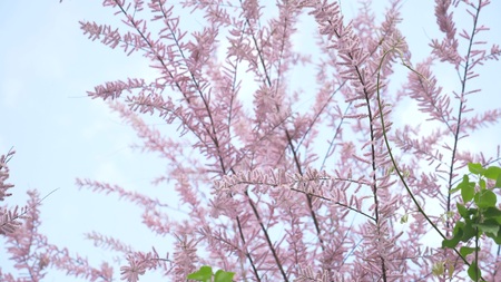 Blooming branches of tamarisk shrub and sky. Spring airy background with pink flowering plants. Close-up, soft selective focus