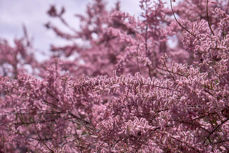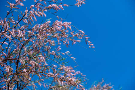 Blooming branches of tamarisk shrub and sky. Spring background with pink flowering plants. Close-up, soft selective focus
