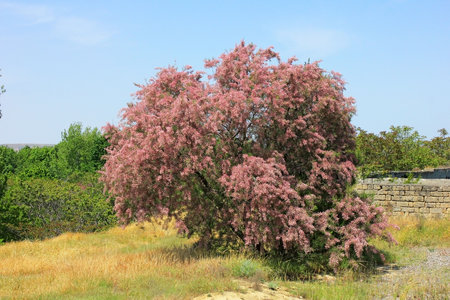 Tamarix bushes blossom tamarix gallica twiggy shrub covered with pink flowers