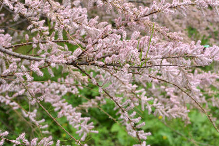 Flowers Grebenshik or Tamarix Gallica or French Tamarisk bush with small flowers blooming in spring