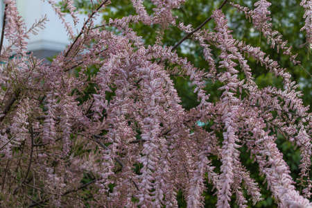 Flowering branches of tamarix, tamarix, pink flowers. Tamarix bush blooming in early spring the garden. Light spring breeze