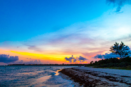 Awesome amazing and colorful sunset sunrise at the tropical Mexican Caribbean beach landscape panorama with clear turquoise blue water resorts and palm trees in Playa del Carmen Mexico.