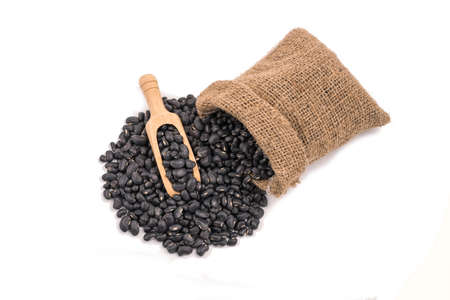 Sack of black beans spill beans with black beans in a wooden spoon on white background.