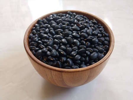 Close up, Seeds black beans (Vigna mungo) in wooden bowl on white cement floor, Phaseolus mungo, Food, Grains