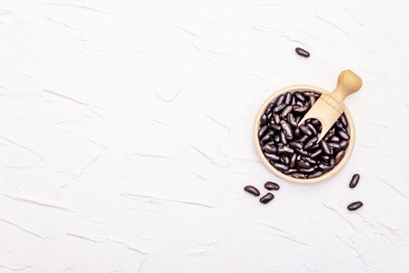 Black turtle beans on bright surface with copy space. Shallow depth of field.