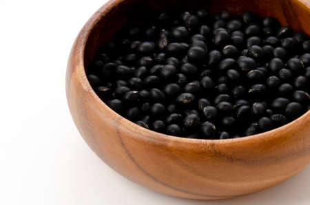 Black soy bean seeds in a wooden bowl with spoon on white background