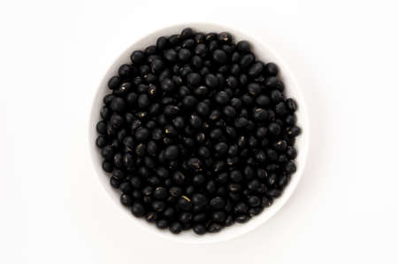 Black soybeans in brown wooden bowl isolated on white background, top view. Healthy organic super food concept