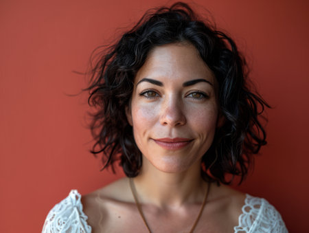 Portrait of a beautiful middle aged woman with curly hair at the beach
