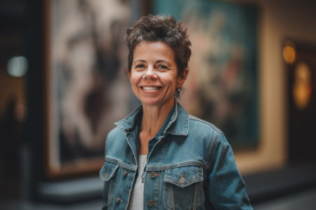 Portrait of a smiling middle-aged woman in a denim jacket.