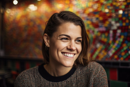 In a softly lit room, a cheerful woman exudes positivity with her radiant smile. Her casual attire and relaxed demeanor create a friendly atmosphere, perfect for connection.