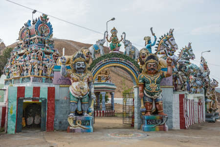 Madurai, India - October 21, 2013: Two copies of Karuappan Sami guard the entrance to their shrine. Lakshmi is present on top of the gate. Horses, strong men, Vimanam of sanctuary and more statues.