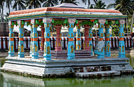 Colorful mandapam of mid-water temple in holy water pond at Tirupati, Andra Pradesh, India.