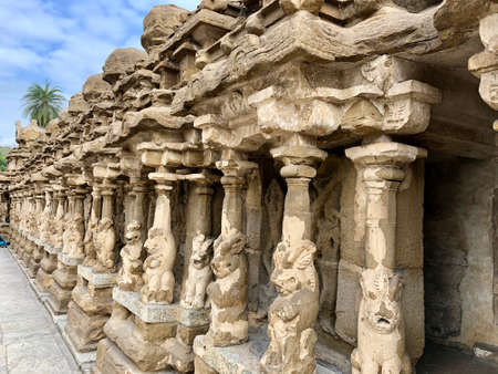 Sandstone sculptures of God and lions are carved prominently as a idols in the ancient kanchi kailasanathar temple in kancheepuram