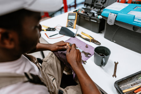 Technician repairs tools in workshop while sitting at desk with various instruments and materials
