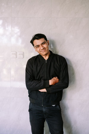 A young man with a playful, amusing expression stands with his arms crossed against a clean, light-tiled wall in a casual indoor setting.