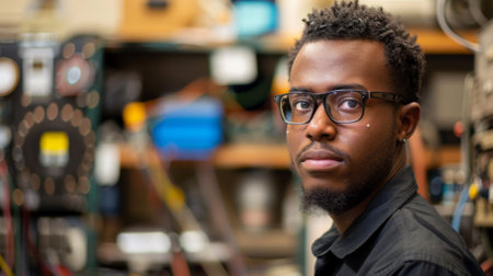 A man with glasses and a black shirt in front of some electronics, AI