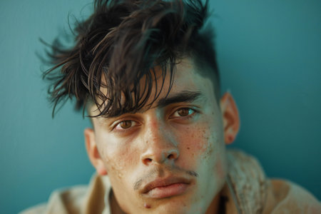 Close-up portrait of a man with curly hair and intense green eyes against a pastel background showcasing beauty and individuality. Generative AI