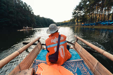 Mae Hong Sorn, Thailand - December 17, 2021 : Beautiful lake over the misty river at sunrise with traveler on the Bamboo raft. Morning view at Pang Oung Lake (Pang Tong reservoir), Mae hong son, Thail