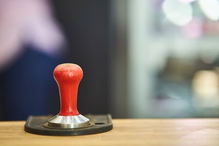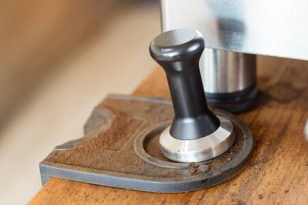 Closeup macro of tamper for pressing ground coffee into portafilter to make espresso hot drink. Small local business work in cafe.