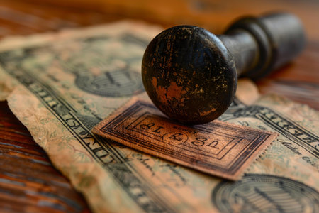 Old currency and stamps with a vintage wooden stamp on a wooden surface