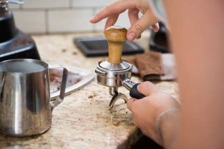 Barista with port filter and espresso tamper. Barista using a tamper to press ground coffee into a portafilter.