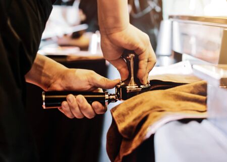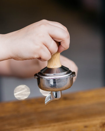 Closed up of barista’s hand tamping the portafilter before making fresh coffee in a coffee shop.