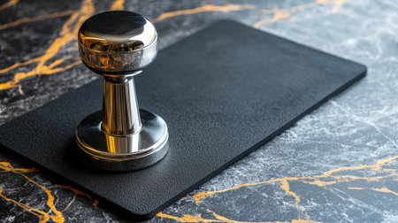 Coffee tamper mat used by baristas, with a polished stainless steel tamper resting on it
