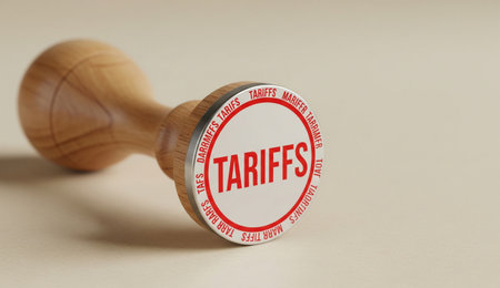 a wooden stamp with the word tariffs in red. it represents trade, finance and international business policy.